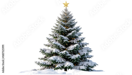 Christmas tree covered with snow and decorated glowing star festive holiday seasonal winter celebration design isolated on white background
