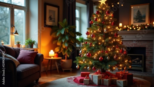 Christmas tree decorated with festive lights and ornaments in a cozy room , cozy, festive