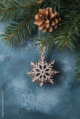 christmas, decoration, snowflake, wood, pine cone, tree, tree branch, winter, holiday, festive, celebration, ornament, blue, background, season, december, new year, christmas, greeting, card, design, object, symbol, traditional, hand-made, rustic, natural, cosy, home, decor, vertical