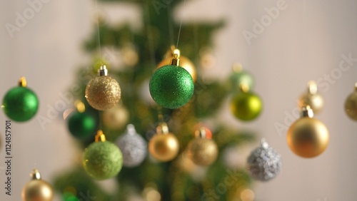 Christmas tree golden, silver and green balls, sparkling colorful toys hanging from above, sparkling ornaments garland close up shot on blurred festive background.