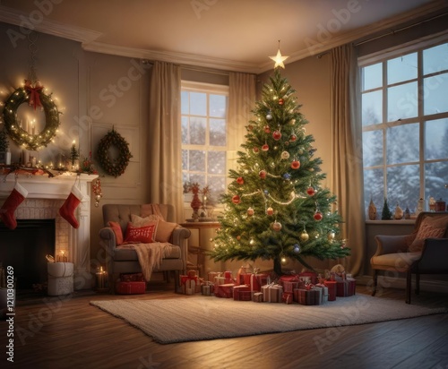 Christmas tree in a cozy living room with ornaments and lights, inviting space, colorful ornaments, festive decor