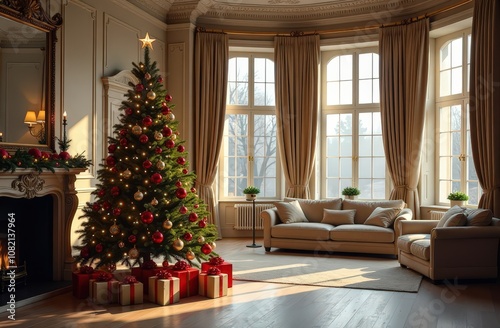 christmas, interior, room, tree, home, window, furniture, decoration, house, christmas, fireplace, holiday, architecture, table, chair, living room, indoor, inside, sofa, decor, christmas tree, light, light, luxury, classic