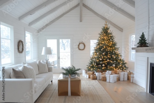 Christmas tree in bright living room with presents