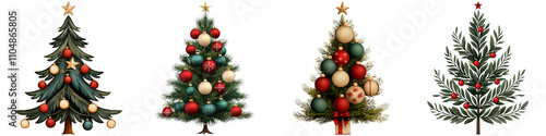 Christmas tree isolated, Four distinct Christmas trees adorned with colorful ornaments and lights, showcasing varying styles and decorations.