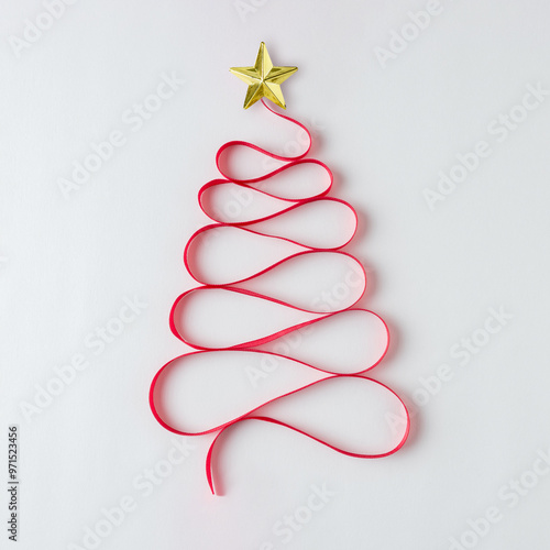 Christmas tree made of red ribbon. Minimal Christmas concept.