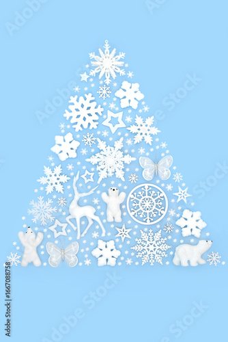 Christmas tree shape magical decorative design concept with frosted white ornaments North Pole theme on blue background. Festive abstract surreal composition.