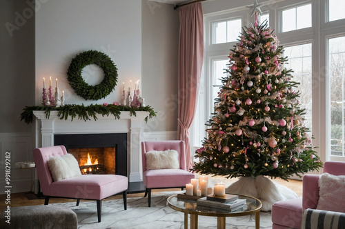 three-dimensional, armchair, background, candle, carpet, celebrating christmas, celebration, chair, christmas, classic, couch, decor, decoration, design, fir, fire, fireplace, furniture, gift, gold, holiday, interior, lantern, light, living, living room, luxury, modern, pink, present, room, sofa, style, table, tree, weekend, window, winter, wrapped