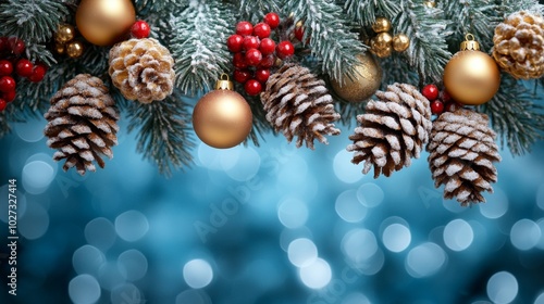 Christmas tree with fir cones and lights bokeh background. Space for text. Copy space. Greeting card.