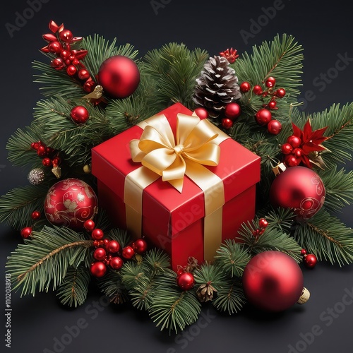 christmas, tree, decoration, holiday, ball, gift, celebration, tree branch, christmas, ornament, winter, fir, green, pine, box, season, year, new, ribbon, red, spruce, gold, christmas tree, december, new year