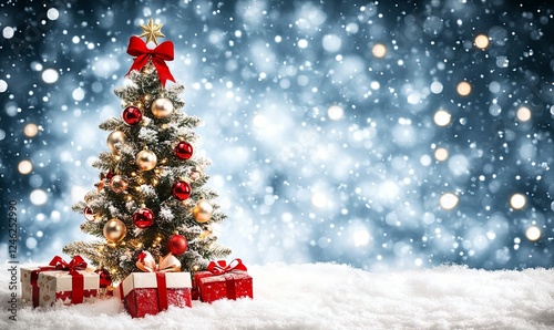 Christmas tree with gifts in snowy scene with bokeh lights, perfect for holiday cards
