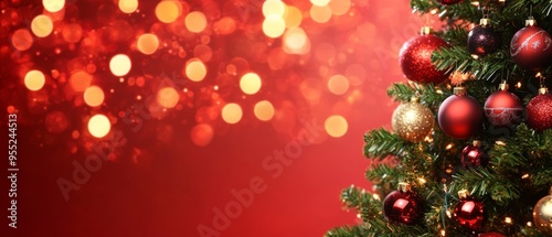 Christmas Tree With Ornament And Bokeh Lights In Red Background