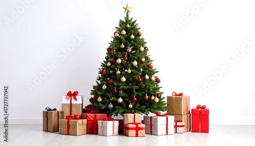 christmas, tree, present, gift, decoration, ornament, red, gold, white, brown, festive, holiday, celebration, room, interior, decor, home, family, tradition, light, happy, joy, warm, bright, cosy, beautiful, elegant, classic, celebratory, stylish, simple, modern, clean, organised, stacked, wrapped, bow, floor, style
