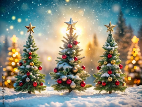 Christmas trees adorned in shimmering lights stand proudly in a snowy wonderland, surrounded by a magical bokeh effect, radiating warm holiday cheer and joy.