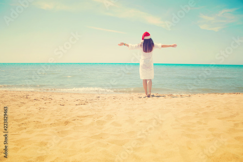 Christmas vacation. Christmas beach vacation travel woman wearing Santa hat and bikini enjoying christmas on tropical beach. woman in santa hat and bikini. toned