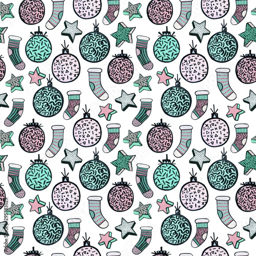 Christmas watercolor seamless pattern in minimal memphis style with stars, socks, balls