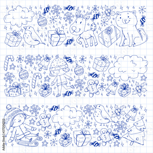 Christmas winter vector background with children. Kids vacation and sport.