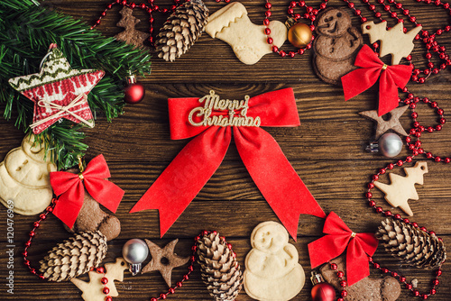 Christmas wooden background with Christmas cookies, cinnamon and Christmas tree.