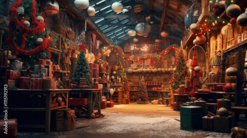 christmas, workshop, warehouse, holiday, store, gift, shop, tree, decoration, light, ornament, snow, winter, season, festive, present, red, green, wood, wooden, rustic, vintage, old, traditional, cosy, warm, cheerful, joyful, magical, enchanted, wonder, wonderland, toy, present, decor, garland, decorative, object