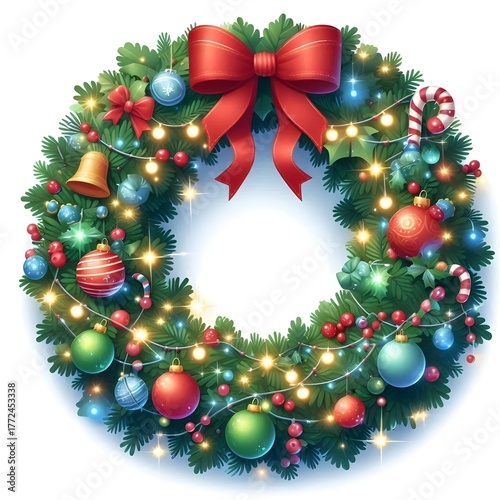 christmas wreath with red ribbon and baubles on white background