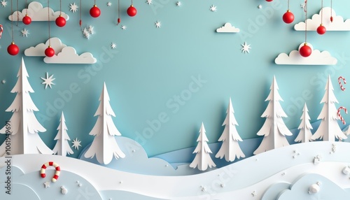 Christmas-Themed Paper-Cut Scene with Snowy Landscape and Stars - Copy Blank Space for Text