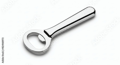 bottle opener, chrome, metal, drink, beverage, beer, cap, open, tool, shiny, white, background, still life, object, single, clean, simplicity, minimalist, studio shot, kitchen utensile, design, element, utensil, domestic, household, appliance, equipment, stainless steel, polished, isolated, nobody, closeup, topview, macro, crisp, hard, contrast, metallic, light, texture, surface, smooth, modern, sleek, elegant