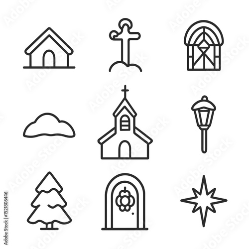 church, icon, set, outline, church steeple, under, snow, cross, stained, glasses, window, mound, bell, tower, path, light, frosted, tree, door, chaplet, star, up high, line, icon