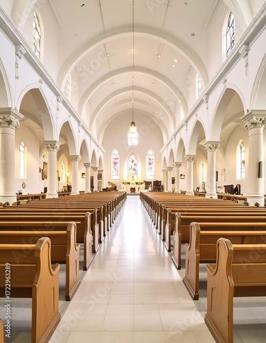 church, interior, roomy, bright, white, arch, clergy, pew, tranquil, holy, faith, worship, light, window, architecture, religious, empty, calm, wooden, design, sunlight, perspective, magnificent, majestic