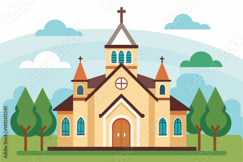 house, cartoon, illustration, church, vector, village, landscape, building, castle, home, architecture, sky, tree, town, summer, city, tower, nature, art, window, street, cloud, hill, fairy tale, fairy