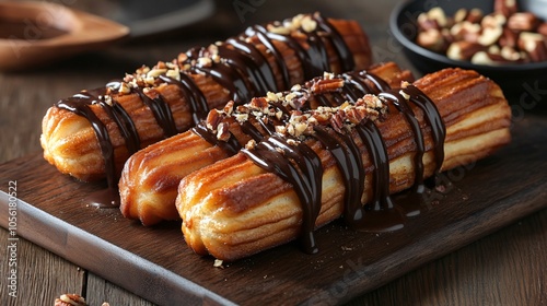Churros with caramel filling, isolated on a dark wood board, with chocolate syrup and crushed pecans