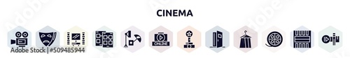 cinema filled icons set. glyph icons such as movie film, tragedy, home cinema, storyboard, studio, online movie, film award, doorway, movie reel icon.