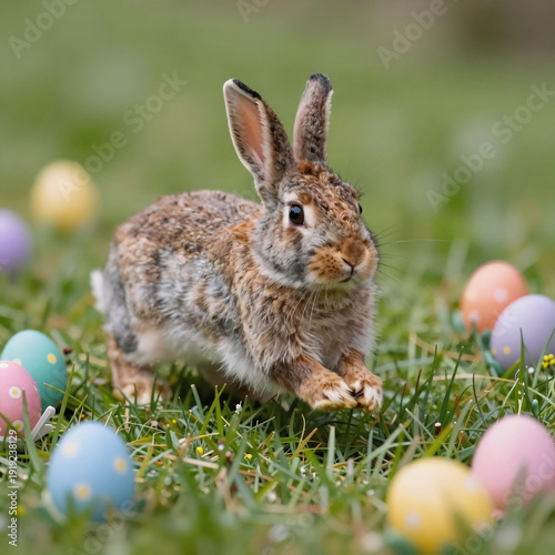 cinematic, easter greeting card featuring a rabbit in grass with decorated eggs
