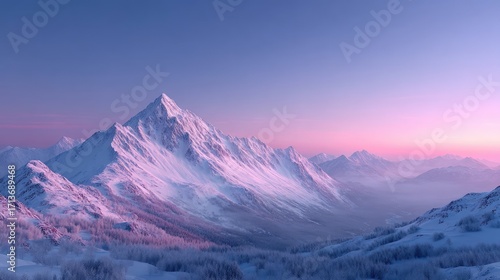Cinematic Hdr Landscape View of Snow Covered Mountain Peaks at Sunset in Shades of Pink and Purple