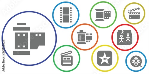 cinematography, icon, set, vector, reel, film, clapper-board, motion picture, art, cinema, isolated, camera, black, illustration, symbol, signs, video, design, studio, entertainment, multimedia, hollywood, screen, white, equipment, media, motion, play, director, object, web, graphic, background, element, industry, filmstrip, television
