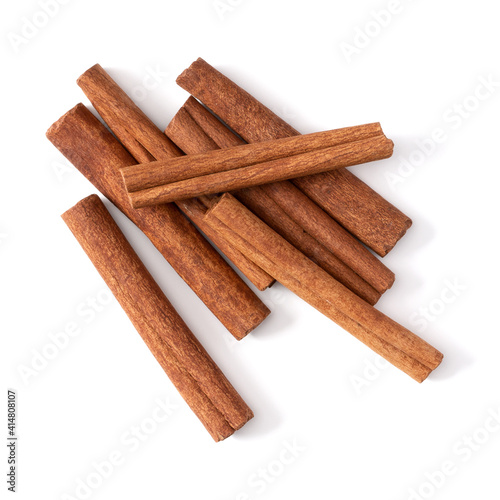 Cinnamon sticks isolated over white background closeup. Canella spice. Aromatic condiment background. Flat lay, top view.
