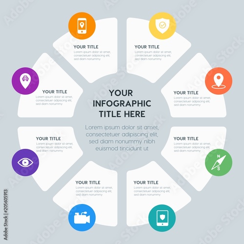 Circle chart location, security, video, photos infographic template with 8 options for presentations, advertising, annual reports