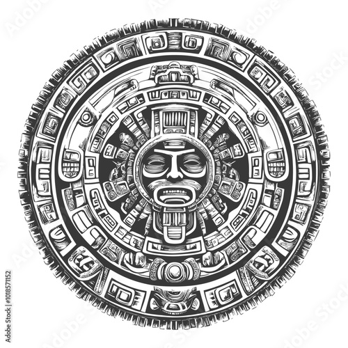 aztec, design, circular, central, face, ancient, civilisation, culture, art, glyphs, symbol, icon, motif, pattern, geometric, symmetric, intricate, detailed, black, white, illustration, graphic, abstract