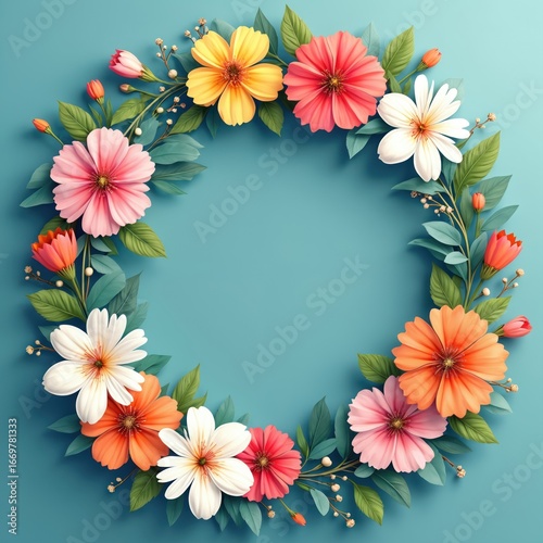 floral, frame, flower, spring, summer, blooming, blossom, bouquet, botanical, nature, garden, floral pattern, chaplet, circular, round, decorative, invitation, card, greeting card, celebration, wedding, anniversary, birthday, event, decoration, festive, romantic, elegant, pastel, pink, orange, yellow, white, red, green leaf, bud, vintage, retro, illustration, graphic design, background, template, beauty, natural, organic, seasonal, fresh, delicate, ornamental