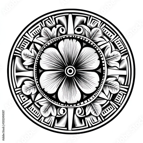 mandala, flower, floral, flower petals, leaf, circle, round, black-and-white, monochrome, graphic design, illustration, art, design, pattern, texture, ornate, intricate, detailed, tribal, tattoo, symbolic, decorative, aesthetic, ink, drawing, vignetting, engraving, vintage, classic, elegant, symmetric
