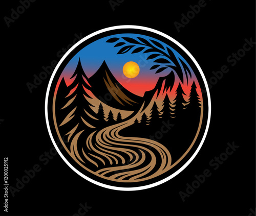 circular landscape, mountain silhouettes, winding river, pine trees, iconic badge design for t-shirt