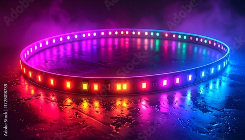led, circular, light, disrobed, rainbow, colours, neon, glow, wet, surface, abstract, gradient, modern, technology, dark, smoke, fog, geometric, shape, design, effect, vibrant, coloured, dynamic, ambient, lighting, studio, art