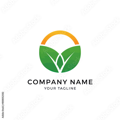 Circular nature logo with green leaves and a golden sun arc.