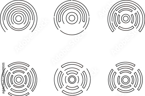 Circular radar waves set with concentric signal rings, clean outline style technology interface elements vector design collection
