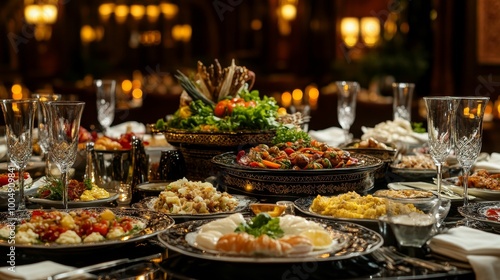 Circular table with an exquisite array of world cuisine, from Mediterranean to Asian, colorful platters, luxurious linens, and sparkling glassware under soft lighting