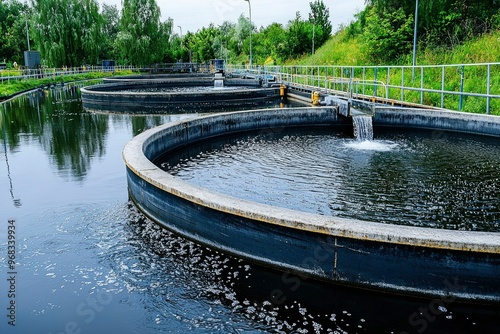 water, treatment, basin, circular, flow, flowing, plant, concrete, grey, blue, black, white, bubble, ripple, surface, edge, rim, fence, metal, railing, green, grass, tree, leaf, sky, ground, overcast, cloudy, outdoors, industrial, infrastructure, engineering, sanitation, technology, environmental, nature, landscape, urban, structure, design, construction, maintenance, operation, system, process, clean, distilled