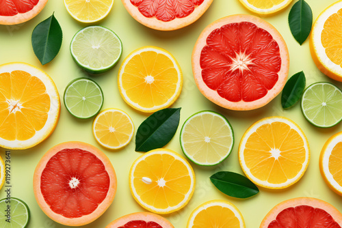 Citrus Fruits Background flat lay on Green Background