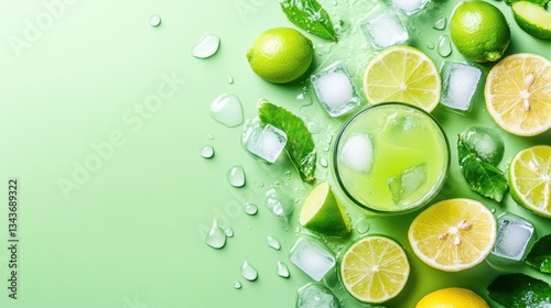 Citrus Refreshment: A refreshing close-up of a vibrant green cocktail, surrounded by fresh limes, mint leaves, ice cubes, and water droplets, creating a summery scene