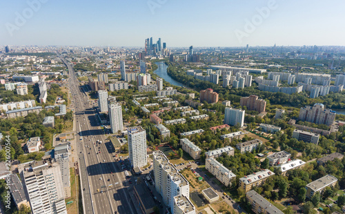 city, building, metropolis, house, road, highway, moscow, russia, summer, sky, flight, height, helicopter, skyscraper, contrast, housing, architecture, landscape, aerial