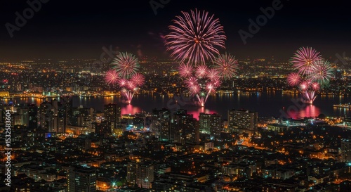 fireworks, city, night, display, water, celebration, colourful, light, spectacular, amazing, beautiful, night view, urban, skyline, pyrotechnic, explosion, festive, summer, holiday, event, vibrant, illumination, illuminated, aerial, photo, panorama, bright, show
