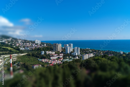 city houses in the metropolis on the ocean sea with the effect of miniatures, tilt shift, cityscape, view of the city top