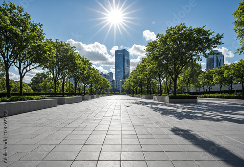 city, urban, city landscape, park, piazza, square, skyscraper, building, modern, architecture, downtown, business district, tree, nature, green, sunny, sun, sky, blue, cloud, pavement, paseo, path, perspective, summer, tranquil, scene, landscape, beautiful, contemporary, finance, business building, highrise, empty, quiet, metropolitan, city life, background